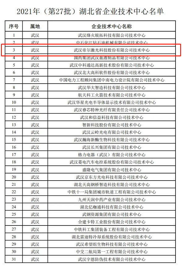 近日,帝爾激光企業(yè)技術(shù)中心獲湖北省發(fā)改委2021年(第27批)湖北省企業(yè)技術(shù)中心認(rèn)定。