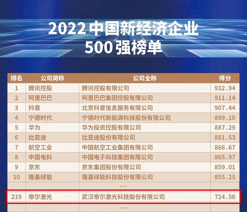 近日,以“加快建設(shè)世界一流企業(yè)”為主題的2022中國(guó)新經(jīng)濟(jì)企業(yè)500強(qiáng)發(fā)布會(huì)在北京舉行。在中國(guó)企業(yè)評(píng)價(jià)協(xié)會(huì)發(fā)布的“2022中國(guó)新經(jīng)濟(jì)企業(yè)500強(qiáng)”榜單中,帝爾激光位列第219位,相較去年的第389位,排名提升了170位。