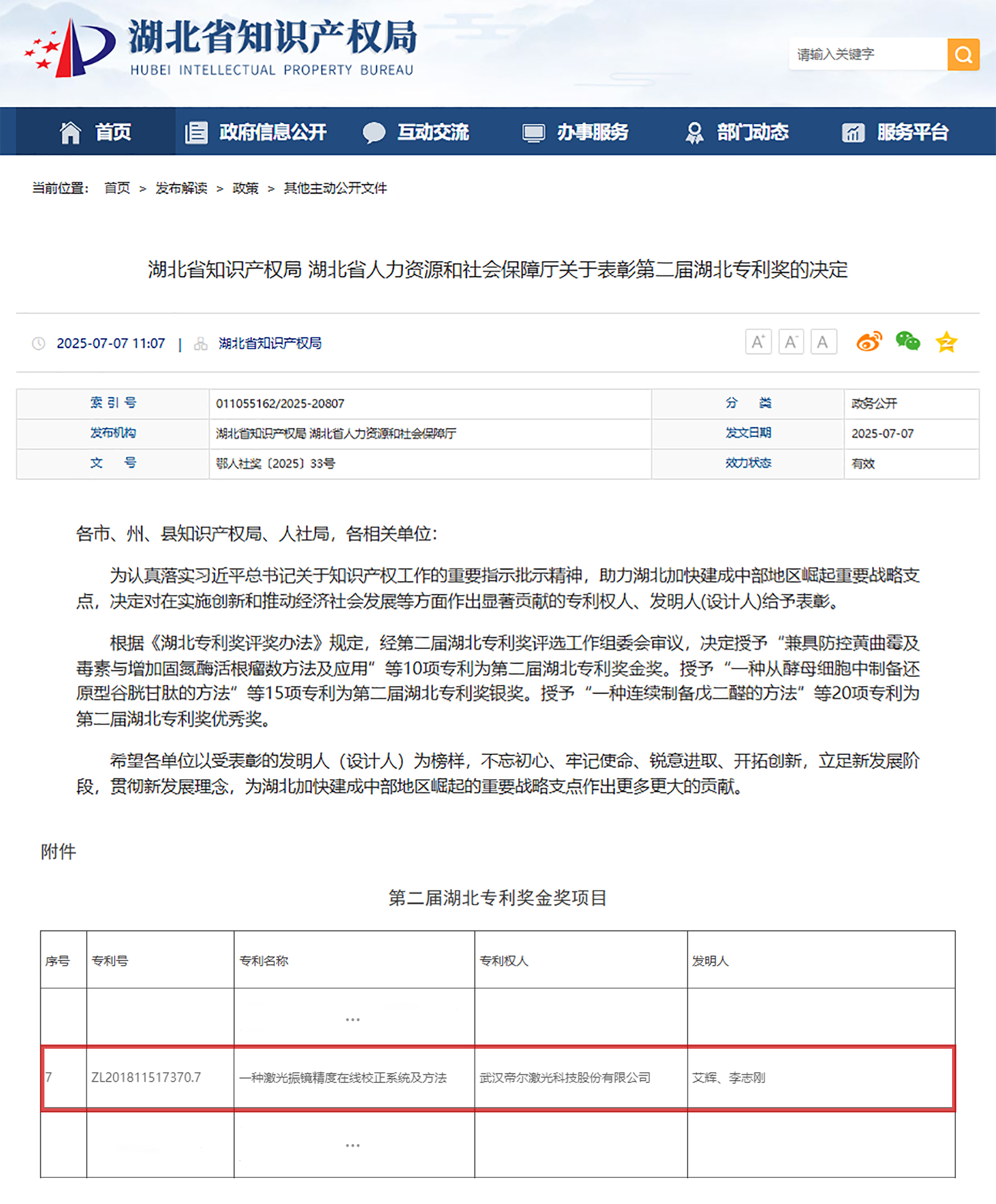 近日,湖北省知識(shí)產(chǎn)權(quán)局、湖北省人力資源和社會(huì)保障廳發(fā)布《關(guān)于表彰第二屆湖北專利獎(jiǎng)的決定》,武漢帝爾激光科技股份有限公司發(fā)明專利“一種激光振鏡精度在線校正系統(tǒng)及方法”榮獲第二屆湖北專利獎(jiǎng)金獎(jiǎng)。